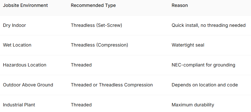 The decision between threaded and threadless connectors and couplings depends on several factors. Jobsite needs, installation speed requirements, the environment (dry, wet, or hazardous), and code compliance all play a role. Threaded systems are favored in industrial and hazardous locations because of their mechanical strength and reliable grounding. On the other hand, threadless systems offer speed and flexibility, making them a top pick for commercial builds with indoor conduit runs.
